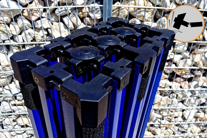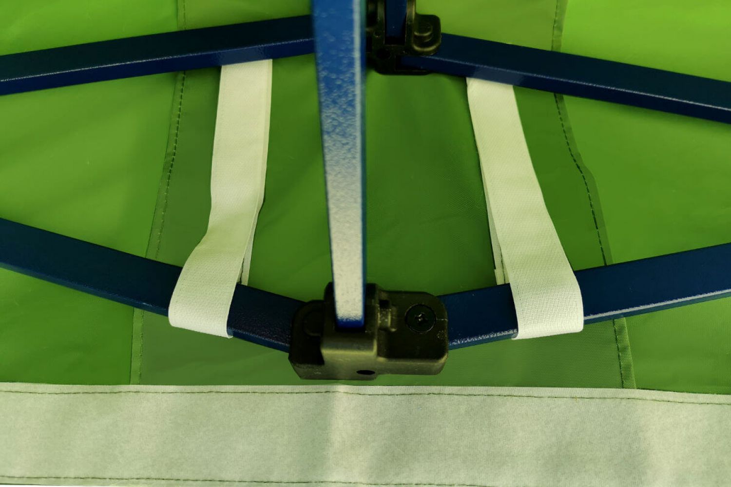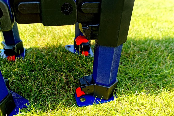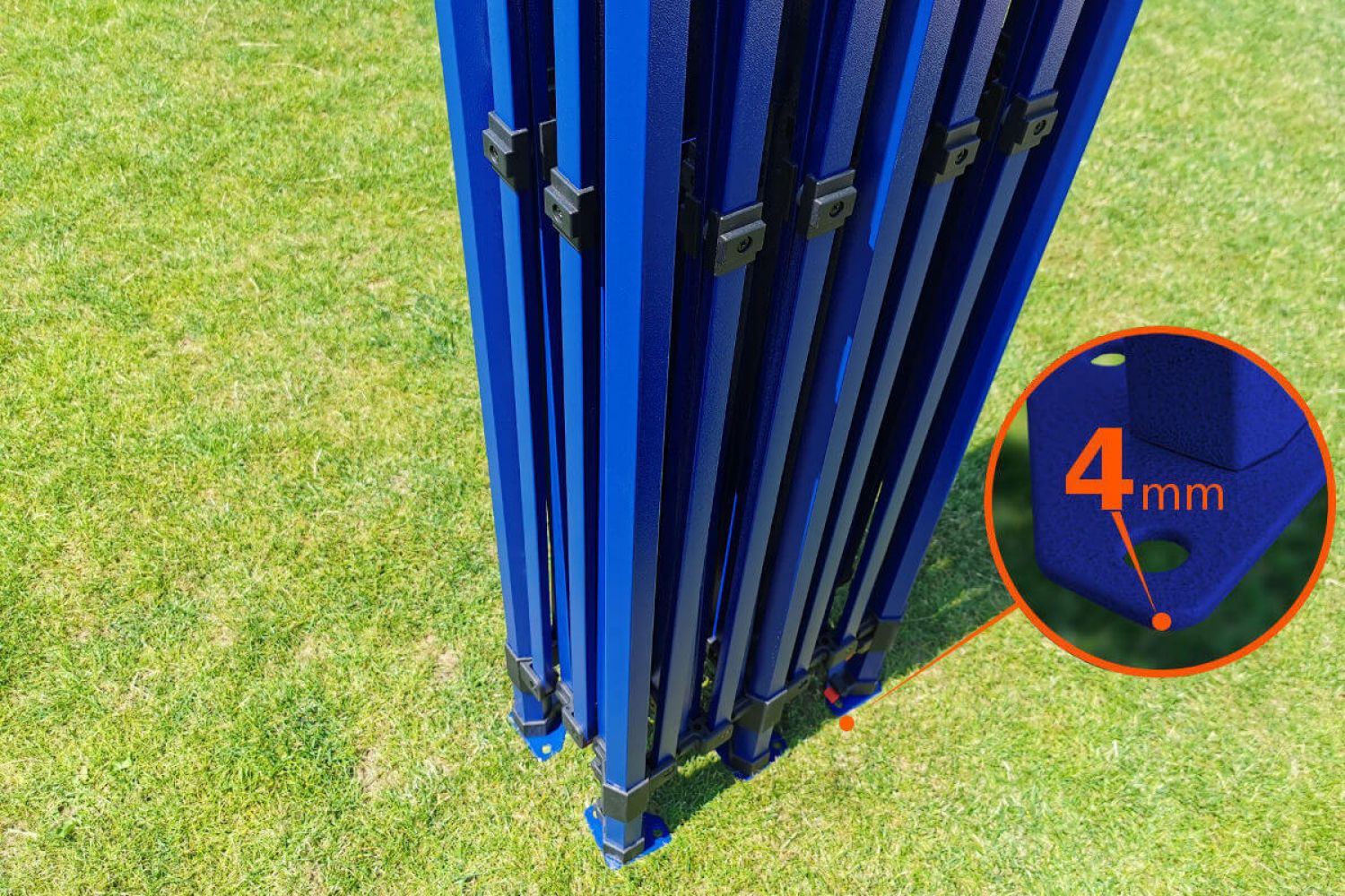 Tout le reste est une structure solide en acier de haute qualité fabriquée à partir de profils épais. Les profils sont recouverts d'une peinture bleue de haute qualité, également résistante à un maniement moins délicat. Les pieds, qui sont en contact constant avec le sol, sont galvanisés et épais. En raison de leur épaisseur, il est difficile d'imaginer une déformation des pieds. Chaque pied possède 2 trous pour l'ancrage avec des piquets, qui sont inclus avec la tente.